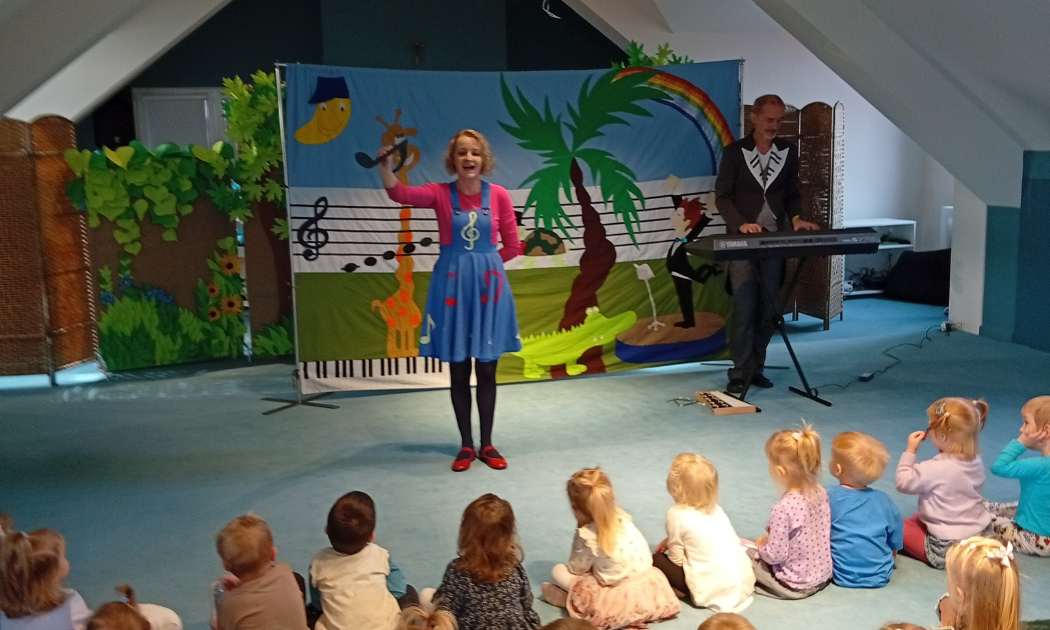 Za sprawą Wiolinki i Bemola, wszystkie dzieci przeniosły się do świata muzyki i szukały jej mieszkania. Czy to w tęczy ukrywa się muzyka?, a może księżyc wie coś na ten temat?, może warto zapytać żyrafy z długą szyją? Na rozwiązanie tych dylematów, był w czas w trakcie spotkania z naszymi gośćmi. Dzieci poznały kluch do świata muzyki – klucz wiolinowy. Zobaczyły też drogę prowadzącą do muzycznego świata, czyli pięciolinię. Poznały także mieszkańców w świecie muzyki, czyli nuty. Spotkanie przepełnione było wieloma wesołymi melodiami i pięknymi utworami w wykonania naszych specjalistą ze świata muzyki – Wiolinki i Bemola.